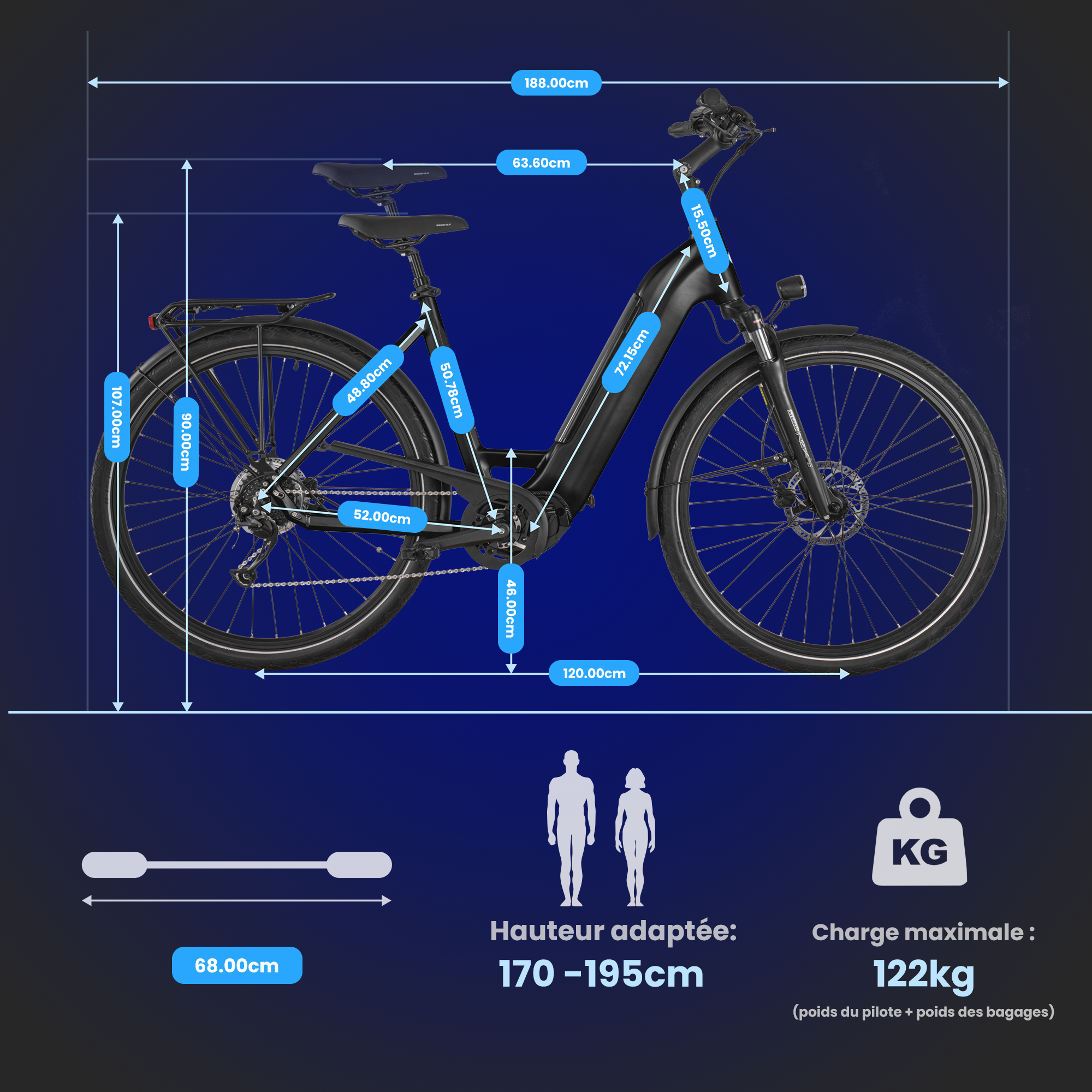 | Charge maximale & gabarit utilisateur | Supporte jusqu’à 122 kg (pilote + charge), recommandé pour des tailles entre 170 et 195 cm. |